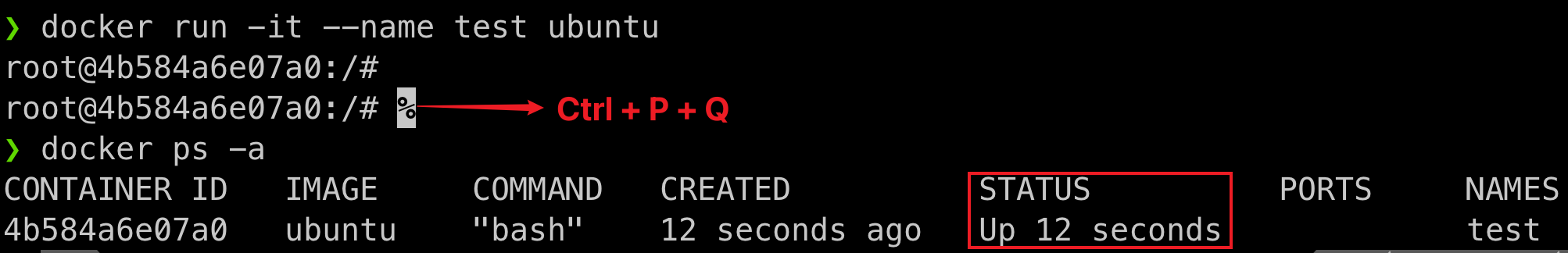 Ctrl + P + Q를 눌러 컨테이너에서 빠져나온 뒤, docker ps -a로 상태를 확인하니, STATUS가 Up 12 seconds입니다. 즉, 컨테이너가 중지 없이 실행된 지 12초 지나고 있다는 뜻입니다. 해당 컨테이너에 다시 들어가고 싶은 경우 docker attach test (docker attach [컨테이너 이름 or 컨테이너 ID])를 하면 됩니다.