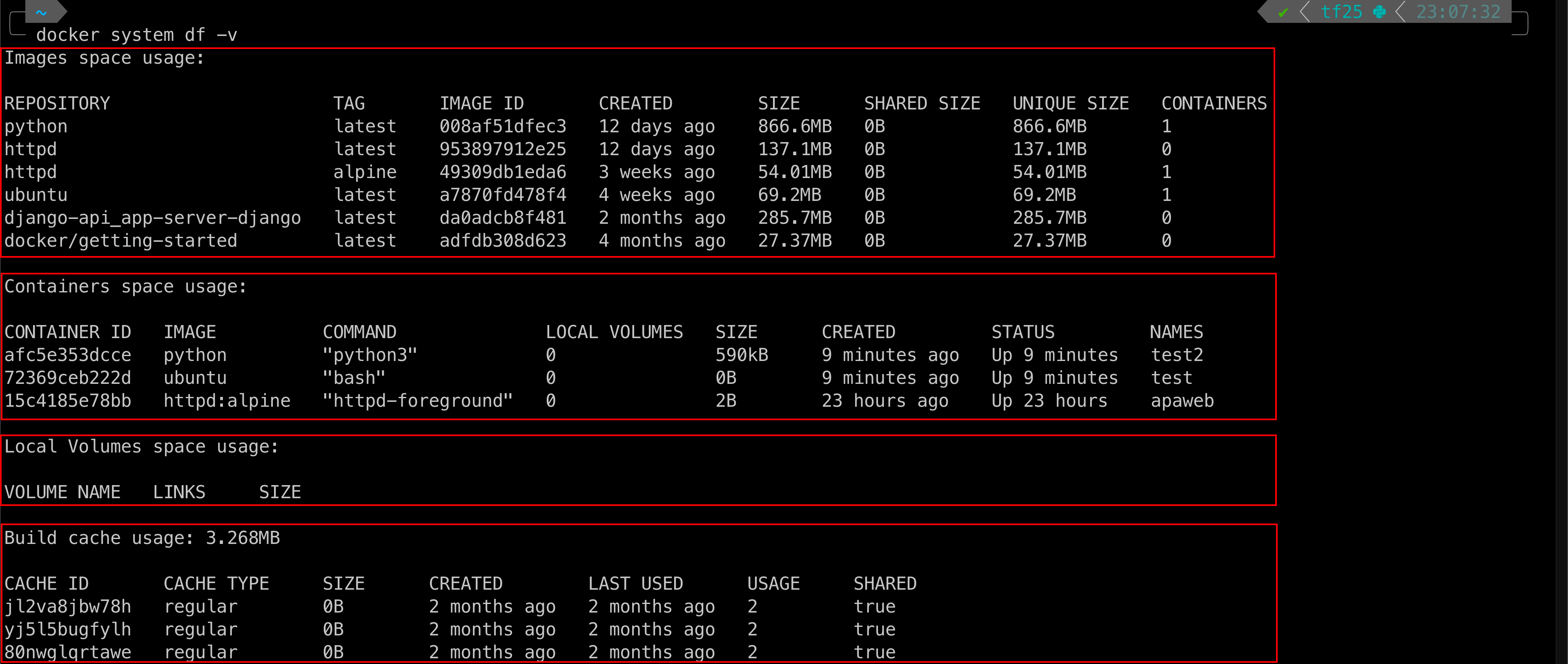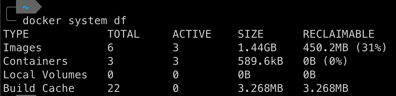 아래 사진을 보면, 빨간 박스로 영역을 나눴습니다. Images space usage에 이미지에 대해 Repository, Tag, ID, 생성 일자(CREATED), 크기(SIZE), 해당 이미지를 사용하는 컨테이너 개수(CONTAINERS) 등의 정보가 나와있습니다. 그 아래엔, Conatiners space usage로 컨테이너에 대한 자세한 정보가 나와있습니다. 컨테이너 ID, 어떤 이미지로 만들어진 컨테이너인지(IMAGE), 컨테이너에 사용된 명령어(COMMAND) 등의 정보가 나옵니다. 다음으로, Local Volumes space usage에 컨테이너에 연결된 로컬 저장소 사용량이 나와있는데, 저는 없어서 따로 나오지 않았습니다. 마지막으로, 캐시 된 용량(Build cache usage)에 대해서도 자세히 나옵니다.