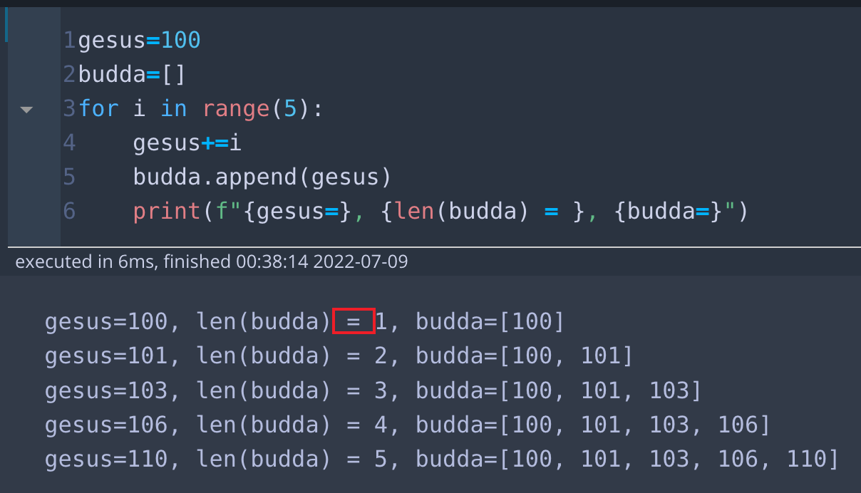 gesus에 100을 할당하고, budda라는 빈 리스트를 정의합니다. 다음으로 for문에서 range(5)로 0부터 5까지 반복하며, gesus에 i를 더해서 다시 gesus에 할당하고, 그 값을 budda 리스트에 append 한 뒤에 gesus와 len(budda), budda를 f-string의 =과 함께 출력합니다.