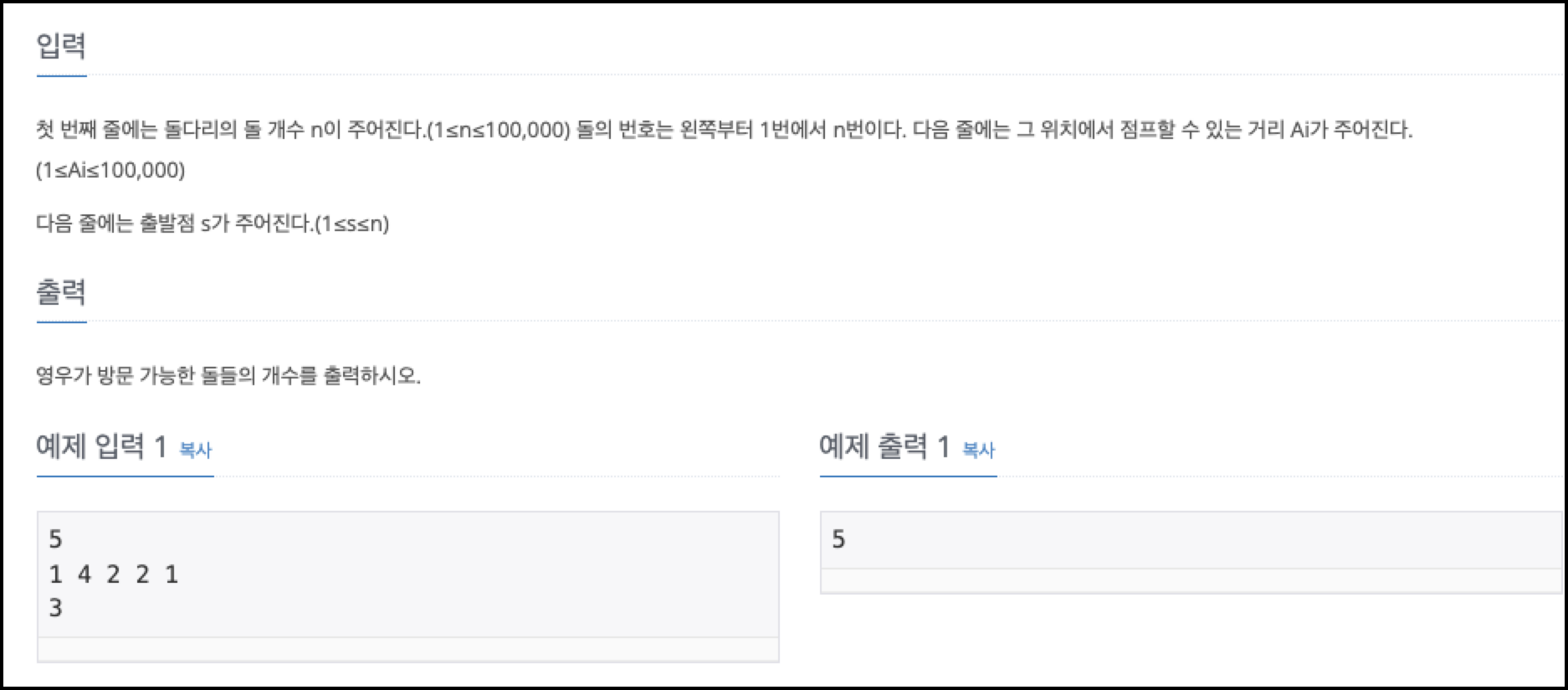 n은 돌 개수를 입력받고, b는 돌다리 별로 움직일 수 있는 칸 개수를 리스트로 받습니다. s는 출발점 위치입니다.