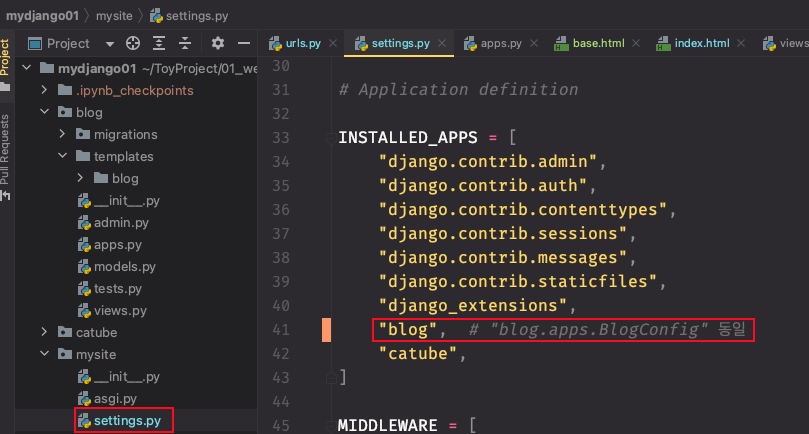 상위에 BlogConfig라는 클래스가 있습니다. INSTALLED_APPS리스트에 "blog.apps.BlogConfig"를 등록하는 것은 정확히는 blog폴더의 apps.py의 BlogConfig 클래스를 등록한다는 의미입니다. 그런데 클래스 내부를 보면 name='blog'라고 되어있습니다. 이름을 blog라고 지정했으니 INSTALLED_APPS에 "blog"라고 적으면, 내부적으로는 "blog.apps.BlogConfig"가 불러와진다고 이해하면 되겠습니다.