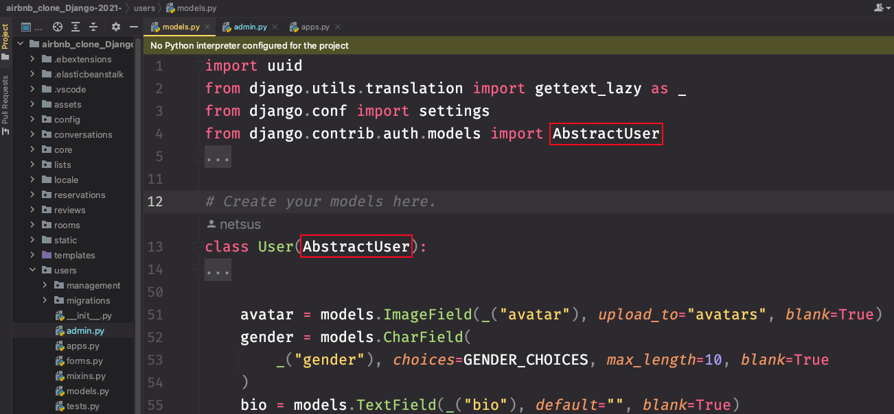 AbstractUser을 상속받아 User 모델을 추가 정의합니다. AbstractUser란 데이터베이스에 저장되지 않는 추상 모델 중 User 부분을 디폴트로 제공해주는 부분을 의미합니다. 즉 상속받게 되면 기존에 장고에서 디폴트로 제공해주던 User의 기능을 모두 사용하실 수 있습니다.