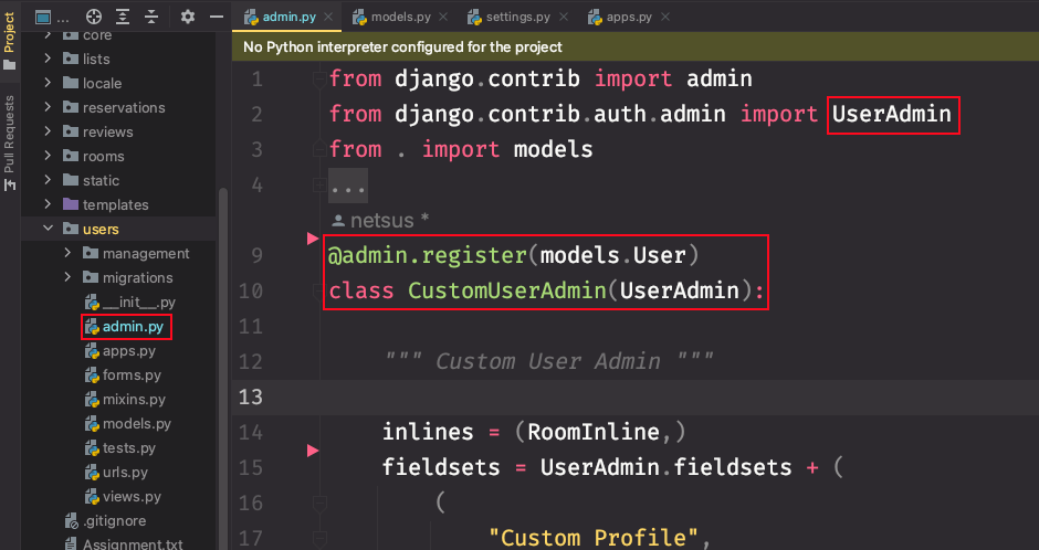 models.User에 대해 UserAdmin(디폴트 유저 어드민)을 상속받은 CustomUserAdmin을 만들어서 admin에 등록하는 코드입니다. class CustomUserAdmin(UserAdmin) 밑에 admin.site.register(models.User, CustomUserAdmin) 해도 동일하게 동작합니다.