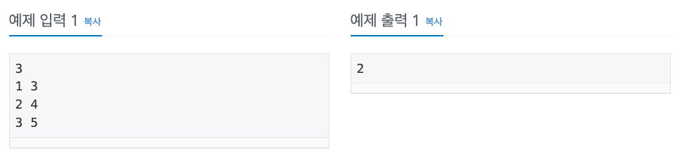 강의 1 3과 3 5는 끝시간과 시작시간이 같으니 한 교실에서 할 수 있지만, 2 4는 겹치기 때문에 다른 교실에서 해야합니다. 즉, 최소로 교실 2개가 필요하므로, 2를 출력합니다.