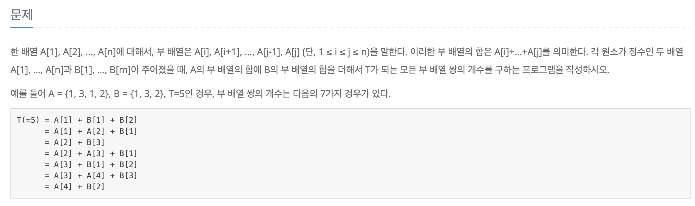 요약하자면, 두 개의 배열 A와 B가 있다. A의 부배열과 B의 부배열의 합이 T가 되는 부배열 쌍의 개수를 구하는 문제입니다. 부배열 이란? 배열 A가 1~n까지 원소가 있을 때, (1 <= i <= j <= n) 을 만족하는 i, j에 대해, A[i] ~ A[j]까지의 합을 뜻합니다. 즉, 부배열 이란 배열의 내부에서 연속되는 원소간의 합을 의미합니다.