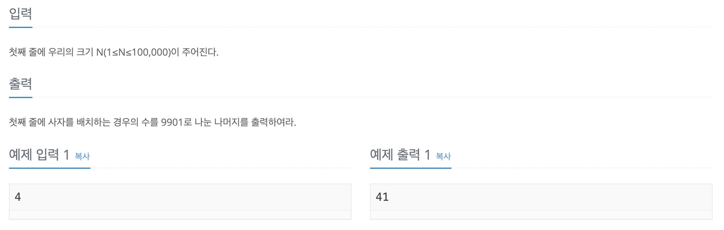 문제를 요약하자면, 우리의 크기 N이 주어질 때, 우리의 크기에 따라 사자를 배치하는 모든 경우의 수를 9901로 나눈 나머지를 출력합니다.