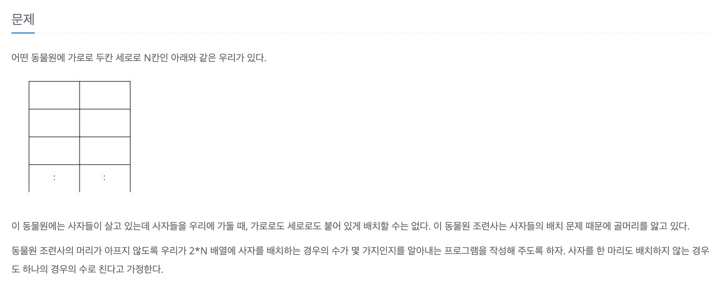 입력으로 4가 주어지면, 4행, 2열짜리 우리에 사자를 채우는 경우의 수를 출력하면 됩니다.