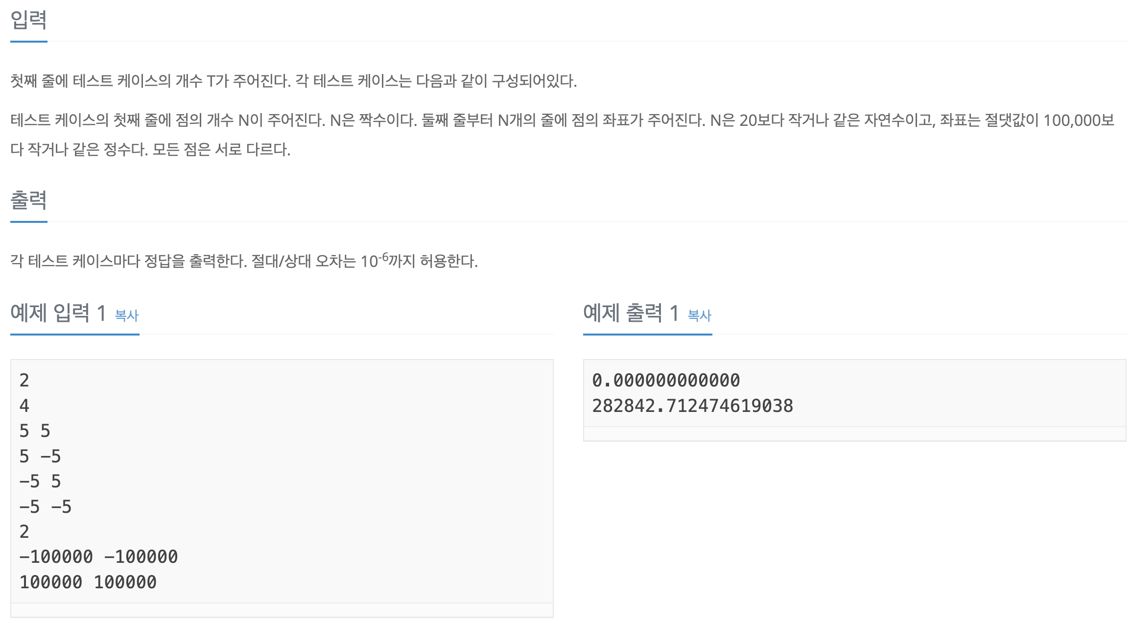문제를 요약하자면, 첫 줄에 테스트 케이스 T가 주어지고, 각 테스트 케이스에 대해 점의 개수 N이 주어집니다. 다음 N개의 줄에 x, y 좌표가 주어집니다. N은 항상 짝수입니다. 좌표 평면에 N개의 점이 있을 때, 모든 점을 사용해서 벡터를 N/2개 만들 때 벡터의 합이 최소가 될 때 최솟값을 출력해야 합니다.