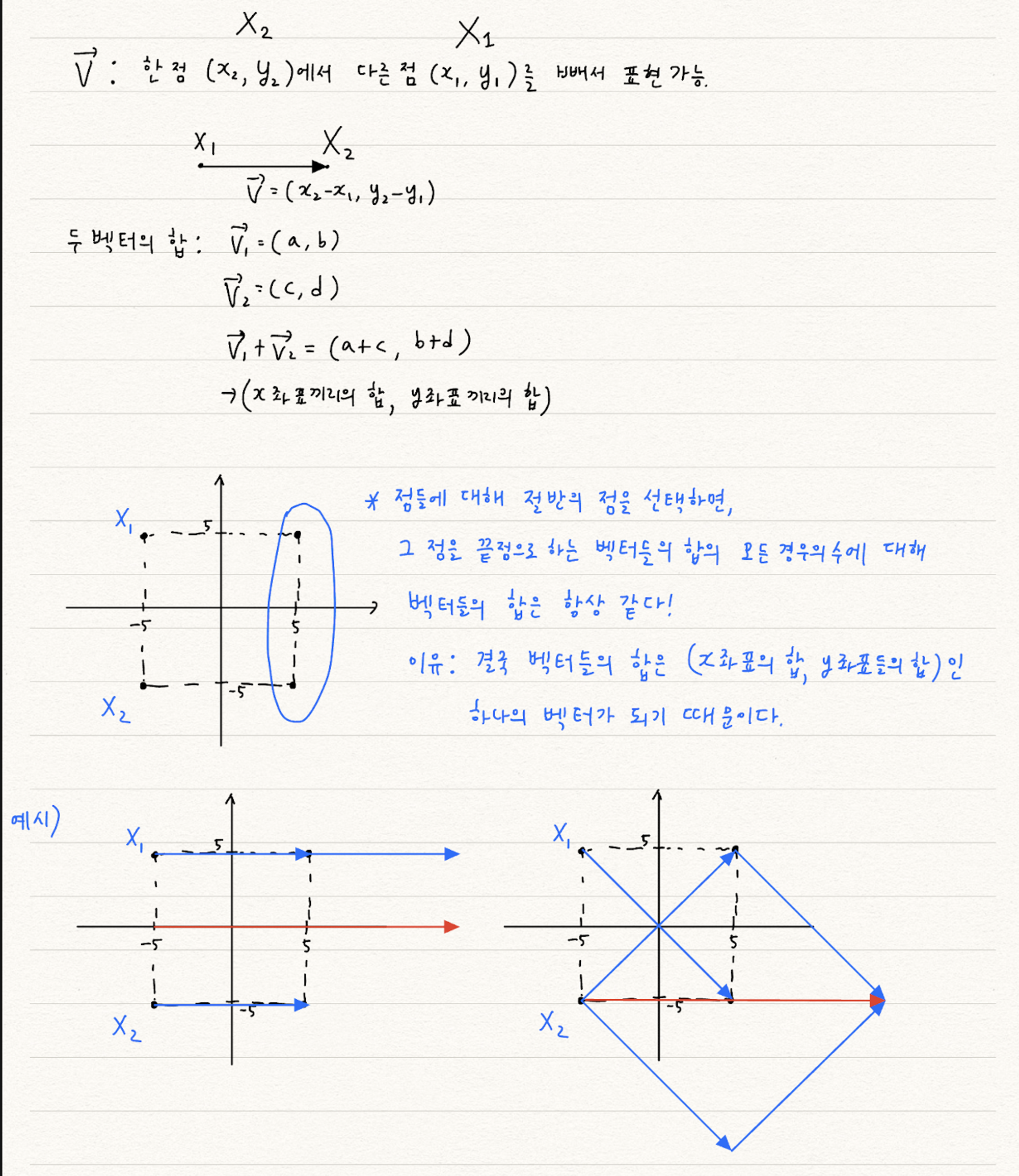 먼저, 저는 이 문제를 풀기 위해 벡터의 개념부터 알아보았습니다. 벡터는 한 점(X2)에서 다른 점(X1)으로 가는 화살표로 표현될 수 있습니다. X2의 좌표에서 X1의 좌표를 뺌으로써 하나의 벡터를 표현할 수 있습니다. 그리고 두 벡터의 합은 각각 x좌표와 y좌표의 합으로 표현할 수 있습니다. 즉, 여러 벡터가 있을 때, 벡터들의 합 벡터는 모든 x좌표의 합과 모든 y좌표의 합으로 표현될 수 있습니다.