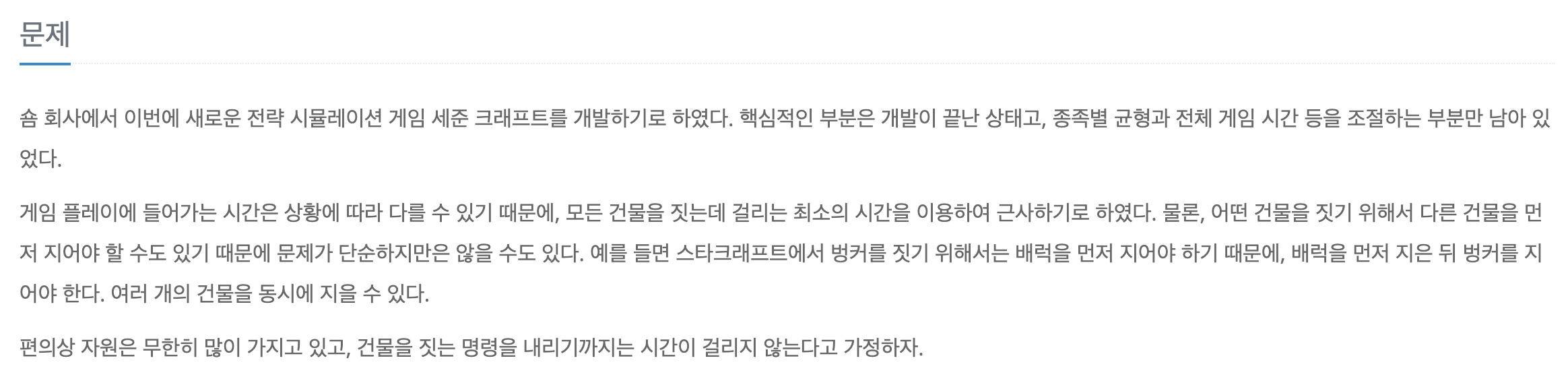문제를 요약하자면, 스타크래프트처럼 건물을 짓는데, 순서관계가 있는 경우, 주어진 N개의 건물에 대해 짓는데 걸리는 최소 시간을 출력해야 하는 문제입니다.