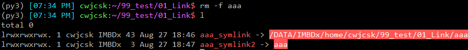 원본파일 aaa를 삭제하니 심볼릭 링크가 깨져 빨간색으로 표시되는 것을 볼 수 있습니다. 이 파일들은 더 이상 아무 내용을 담고 있지 않습니다.