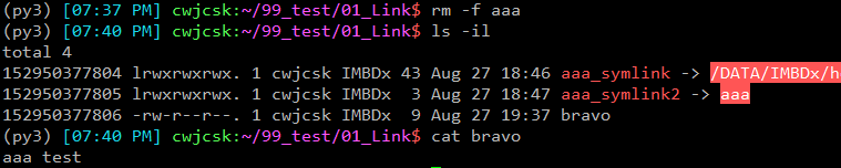 aaa파일을 삭제하면 심볼릭 링크는 다시 깨집니다. 하지만 하드 링크인 bravo는 원래 내용을 그대로 갖고 있는 채로 살아있습니다.