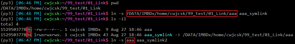 심볼릭 링크는 맨 앞에 iNode가 서로 다른 것을 볼 수 있습니다. 즉, 서로 다른 파일로 구분됩니다. 하지만 이 중 한파일을 수정하면 다 같이 수정됩니다.