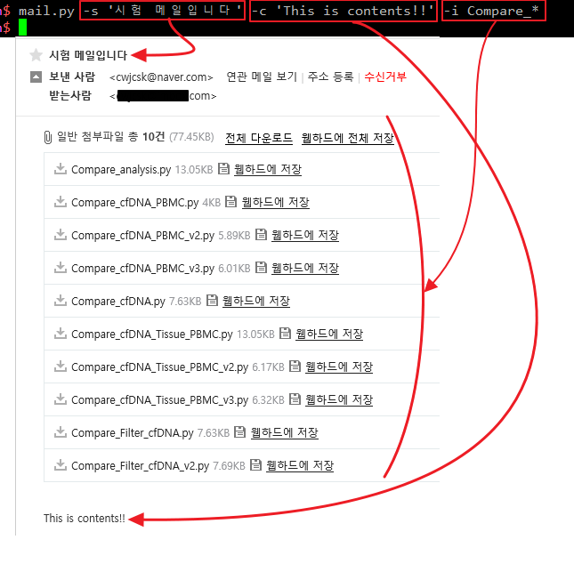코드의 맨 윗줄에 python의 경로를 작성함으로써, 명령어로 python mail.py 를 이용하지않고, mail.py만 사용할 수 있도록 하였습니다. (코드의 맨 윗줄을 지우고, python mail.py 형식으로 사용하셔도 됩니다.)