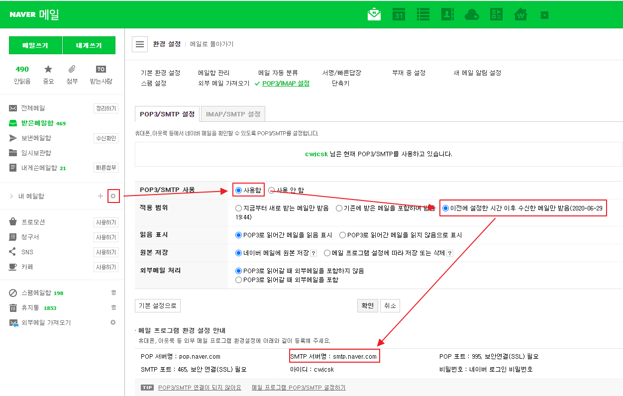 네이버에서 SMTP 사용설정 -> python 코드 다운로드 -> 다운받은 python 코드 맨 윗줄에 python3.6 경로 설정